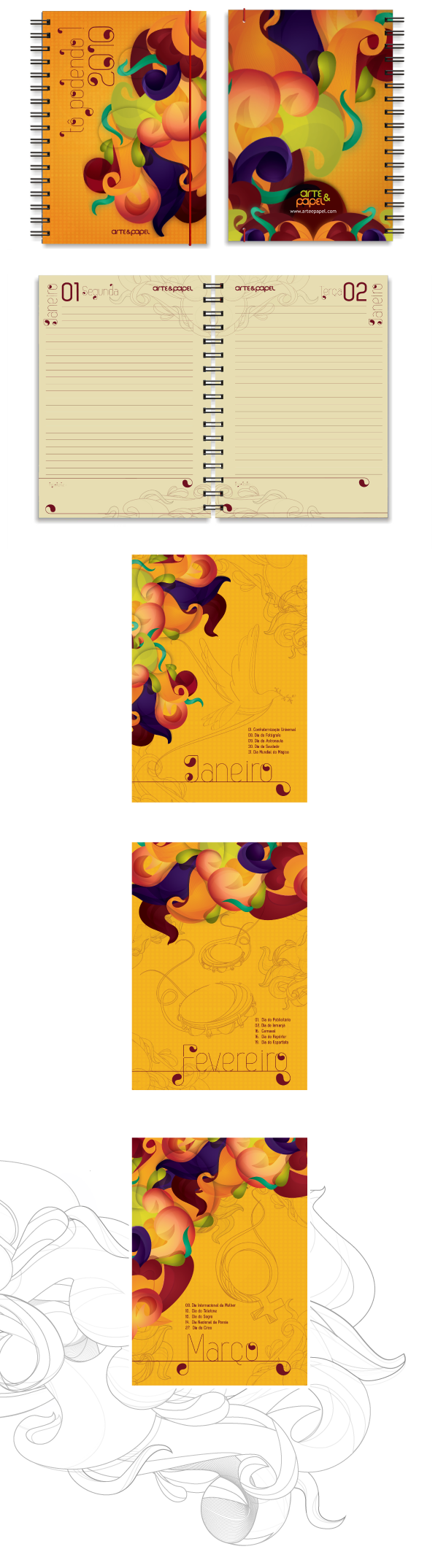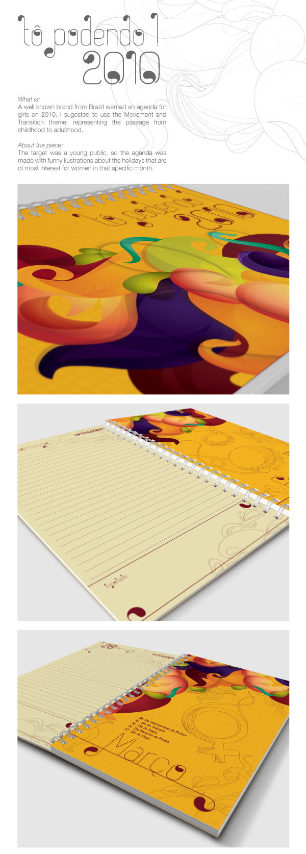 What is: A well known brand from Brazil wanted an agenda for girls on 2010. I sugested to use the Movement and Transition theme, representing the passage from childhood to adulthood. About the piece: The target was a young public, so the agenda was made with funny ilustrations about the holidays that are of most interest for women in that specific month.